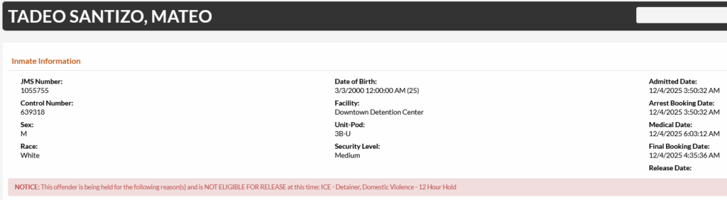 • Tadeo-Santizo was charged with two counts of failure to appear, domestic assault with bodily injury, and criminal impersonation. He was booked on a $4000 total bond. His charges of failure to appear stem from August 2025 charges of no driver’s license and insurance/evidence of compliance.