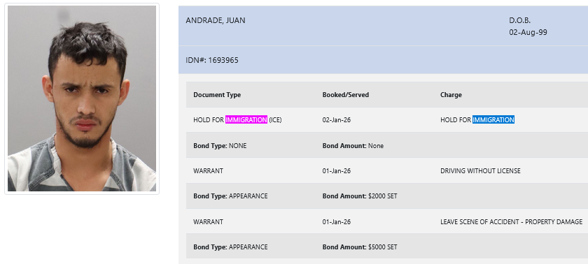 Knox County police arrested 26-year-old Juan Andrade on January 1. Andrade was charged with driving without a license and leaving the scene of an accident with property damage. He was booked on a $7000 bond.