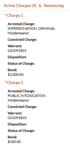 - Belmontes was charged with criminal impersonation, public intoxication, disorderly conduct, and leaving the scene of an accident with damage over $1500. He was booked on a $3100 bond.