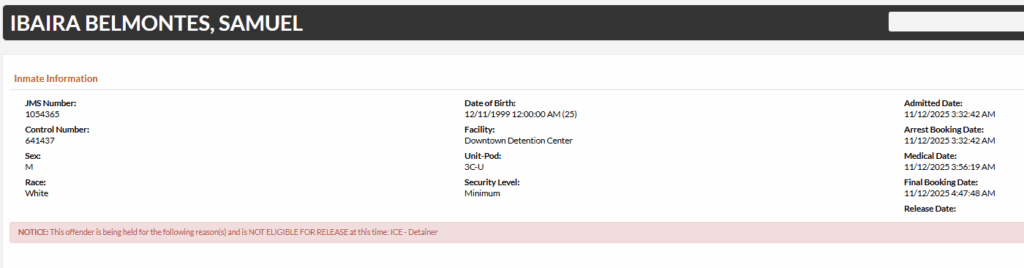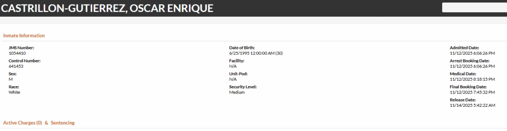- Castrillon-Gutierrez was arrested on a charge of no driver’s license for an offense occurring August 22, 2024. Inmate records do not show bond information at the time of writing.