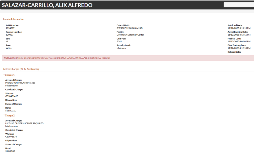 - Salazar-Carrillo was booked on a misdemeanor charge of probation of violation and no driver’s license. He was on probation for driving under the influence on September 14, 2024. He was actually found guilty of a lesser charge of reckless driving and also had charges of violating the open container law and driving without a license dismissed. He was given a $12,000 bond.