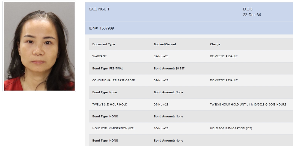 - Cao was charged with domestic assault and was booked with no bond.