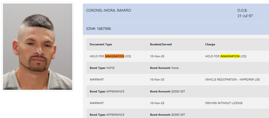- Coronel-Mora was charged with driving with a license and improper use of vehicle registration. He was booked on a $4000 total bond.