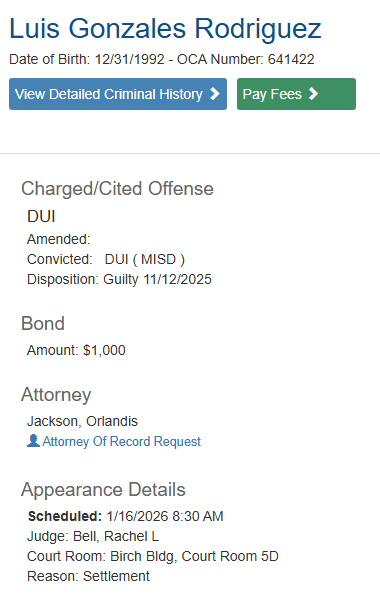 - Rodriguez was charged with driving under the influence and was booked on a $1000 bond. He was found guilty on November 12.