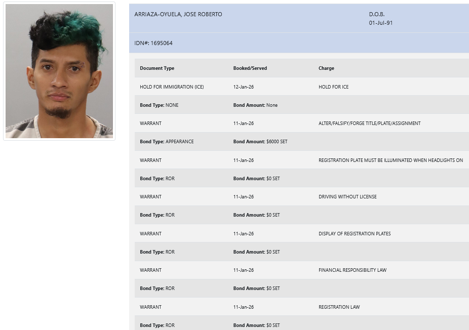 • Oyuela was charged with vehicle license plate infractions including altering, falsifying, forging and apparently not having functional lights illuminating the registration plate, among other charges. No bond was set.