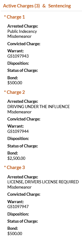 • Patzan was charged with public indecency, driving under the influence, and driver’s license required. He was booked on a $3500 total bond.