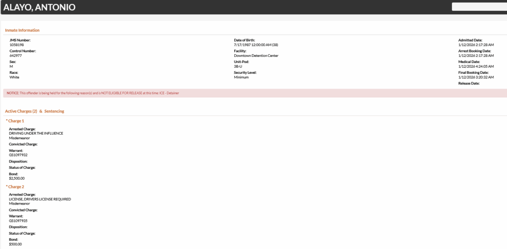 • Alayo was charged with driving under the influence and driver’s license required. He was booked on a $3000 total bond.