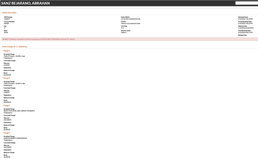 - Bejarano was charged with 2 counts of theft of property ($1000 or less), resisting stop/frisk/halt/arrest/search, and evading arrest. He was booked on a $22,000 bond.