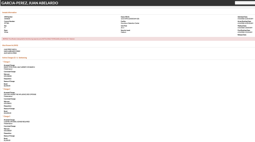 - Garcia-Perez was charged with driving under the influence (third offense), resisting stop/frisk/halt/arrest/search, and driver’s license required. He was booked on a $14,000 bond.