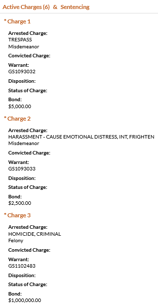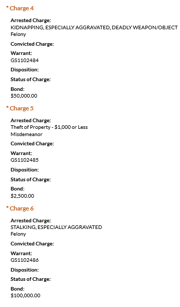 • Alvarado was charged with criminal homicide, especially aggravated kidnapping, trespassing, harassment, especially aggravated stalking, and theft of property under $1000. He was booked on a $1,160,000 total bond.