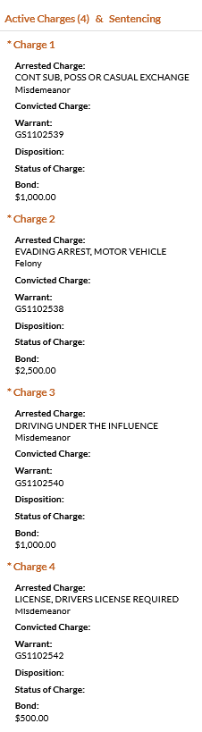 • Nolasco was charged with possession/casual exchange of a controlled substance, evading arrest in a motor vehicle, driving under the influence, and driver’s license required. He was booked on a $500 bond.  Records show that Nolasco was previously charged with reckless driving and no driver’s license in 2024, but those charges were dismissed.