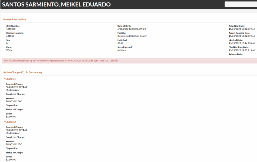 Davidson County police arrested 22-year-old Meikel Eduardo Santos Sarmiento on Wednesday, November 26. He was charged with failure to appear and was booked on a $5000 total bond. He was previously charged with boating in a no wake zone in September.