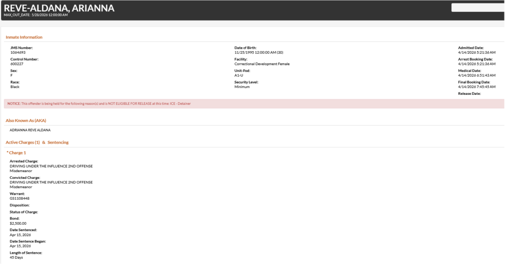 • Reve-Aldana was charged with driving under the influence (2nd offense). She was booked on a $2500 bond but then was sentenced on April 15 to 45 days in jail.