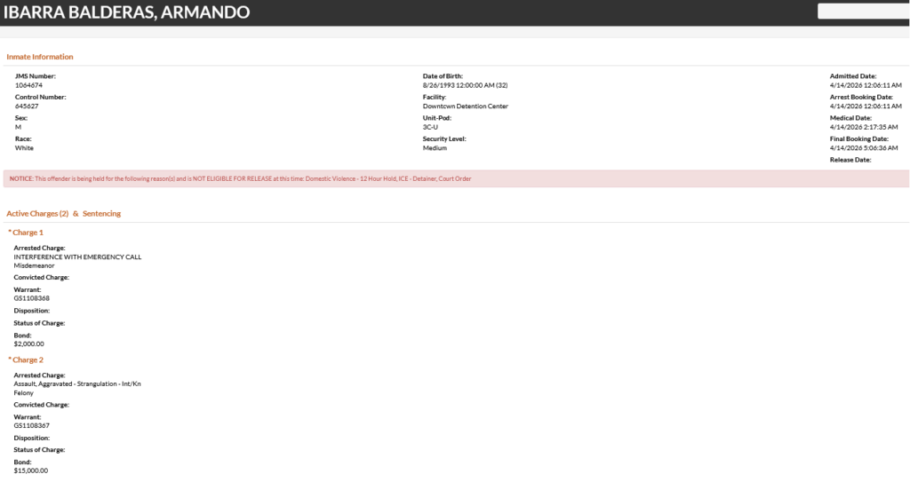 • Balderas was charged with aggravated assault (strangulation) and interference with an emergency call. He was booked on a $17,000 bond.