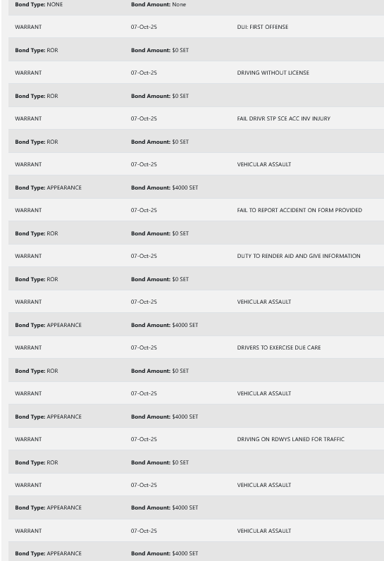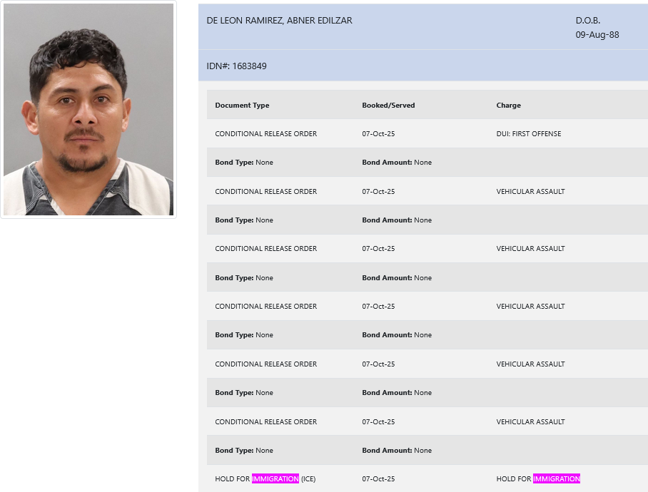 Abner Edilzar De Leon Ramirez (Age 37) – arrested Tuesday, October 7th – charged with multiple vehicular assaults, driving without a license, a first offense of driving under the influence, failure to stop at the scene of an accident involving injury, failure to report an accident, duty to render and give information, failure of driver to exercise due care, and driving on roadways laned for traffic.