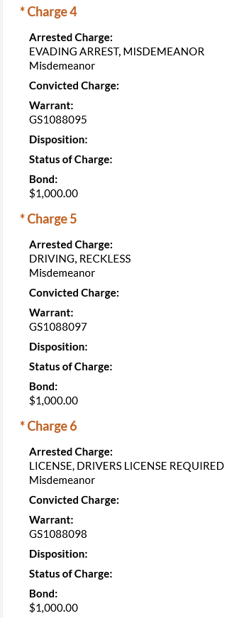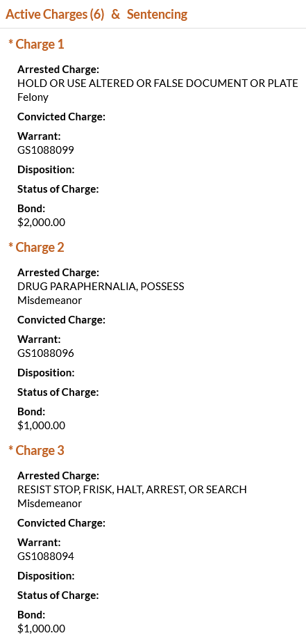 Miguel Lopez (Age 24) – arrested Wednesday, October 8th – charged with hold or use of an altered or false document or plate, possession of drug paraphernalia, resisting arrest, stop, frisk, halt, or search, evading arrest, reckless driving, and failure to provide a driver’s license – bond set at $7,000.