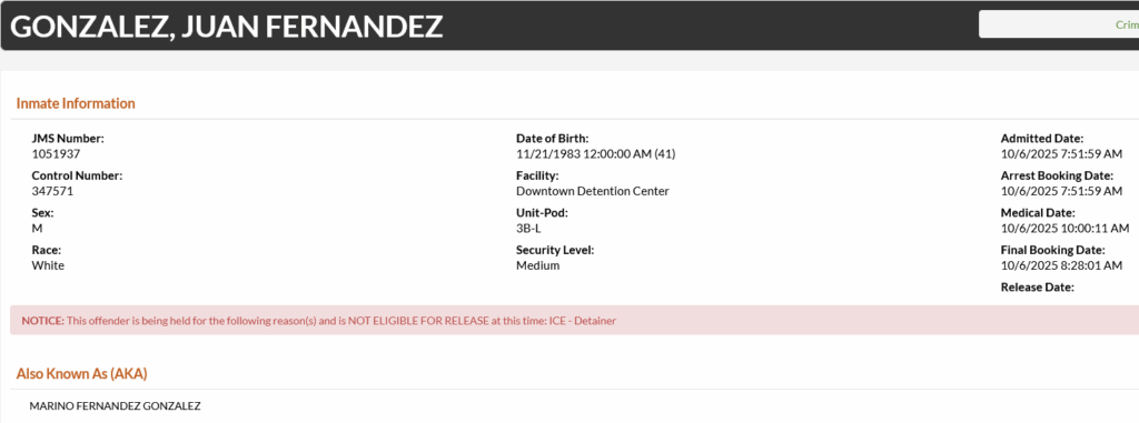 He is being held on medium security at the downtown detention center and is also known as “Marino Fernandez Gonzalez.”