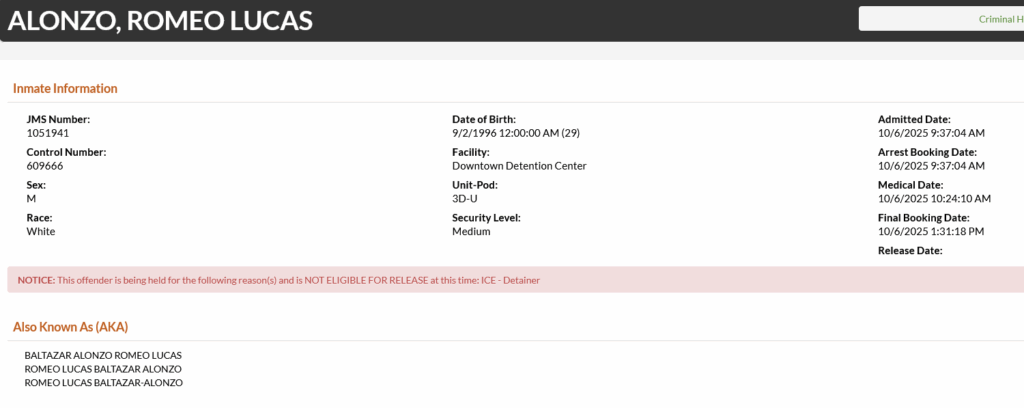 He is being held on medium security at the downtown detention center and is also known as “Baltazar Alonzo Romeo Lucas,” “Romeo Lucas Baltazar Alonzo” and “Romeo Lucas Baltazar-Alonzo.”
