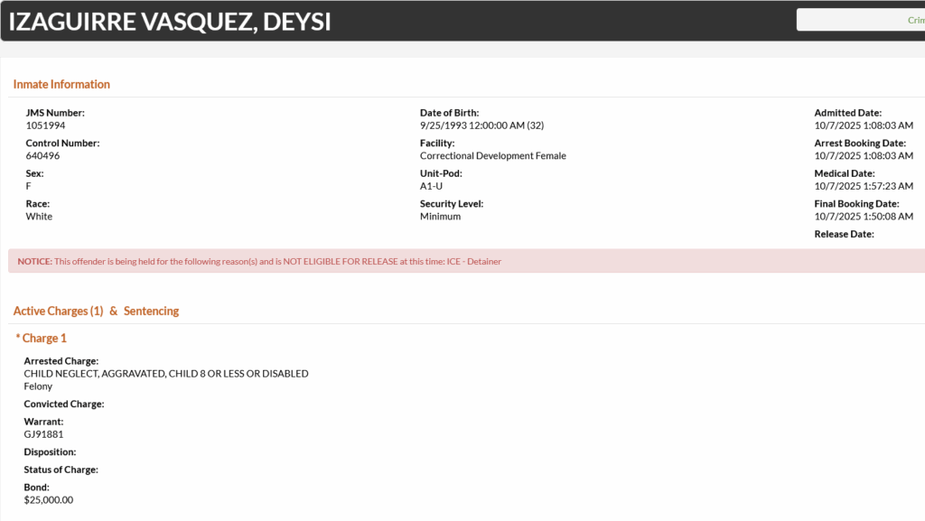 Deysi Izaguirre Vasquez (Age 32) – arrested Tuesday, October 7th – charged with aggravated child neglect involving a child 8-years-old or younger or a disabled child – bond set at $25,000.