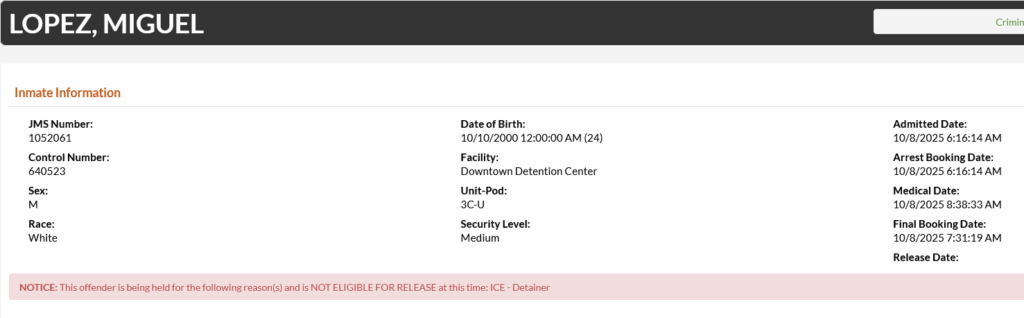 Current inmate records show that the below named individuals arrested this week all have U.S. Immigration and Customs (ICE) detainers.