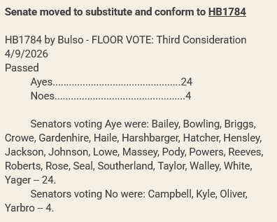 On April 9, the Senate moved to substitute and conform to House Bill 1784 (HB1784) in lieu of Senate Bill 1940 (SB1940).
