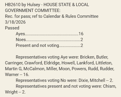 The bill passed in a 16 to 2 vote with 2 abstaining, including Representative Dave Wright (R-Corryton-District 19) which sends it onto the House Calendar and Rules Committee.