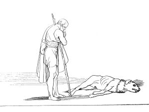 As Fitzgerald puts it, “The man looked away, wiping a salt tear from his cheek.” Does Argos see his master’s tear? Does he sense that Odysseus returns his affection? Odysseus does not want to let Eumaeus see his tear, for that might give away his identity. After all, this is the Odysseus we know, and expect, as a man of action. He has a plan which he is committed to and it does not include even a pat on the head for poor Argos. He deflects attention by drawing Eumaeus into a conversation rich with symbolic meaning: