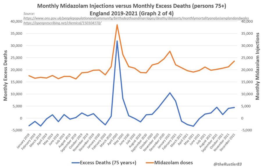 Official figures from April 2020 show that the number of prescriptions for midazolam more than doubled compared with previous months. Office for National Statistics (ONS) data clearly show a correlation between midazolam and 55,000 excess deaths, although authorities will argue that it was administered to patients dying with covid.