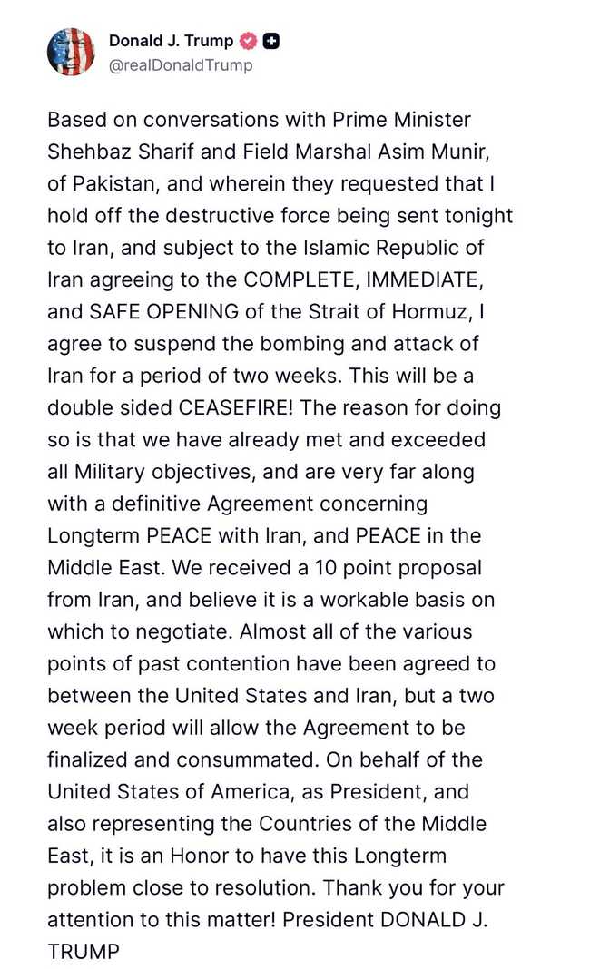 “I agree to suspend the bombing and attack of Iran for a period of two weeks.”