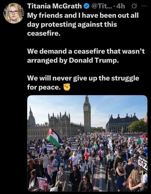 Immediately after the ceasefire, after two years of ‘stop the genocide’ and ‘stop the bloodshed’ came another pro-Palestinian march in the UK. So the marches were never about ending the war. They didn’t want peace. They want the erasure of Israel. So as long as Israel exists, they keep protesting. Do you know what would happen if Israel didn’t exist? They would keep protesting.